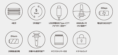 ※3 フル充電し1 日1 回3 分使用の場合。ヒゲの濃さ、肌にあてる力、周囲の温度などにより使用日数は異なります。